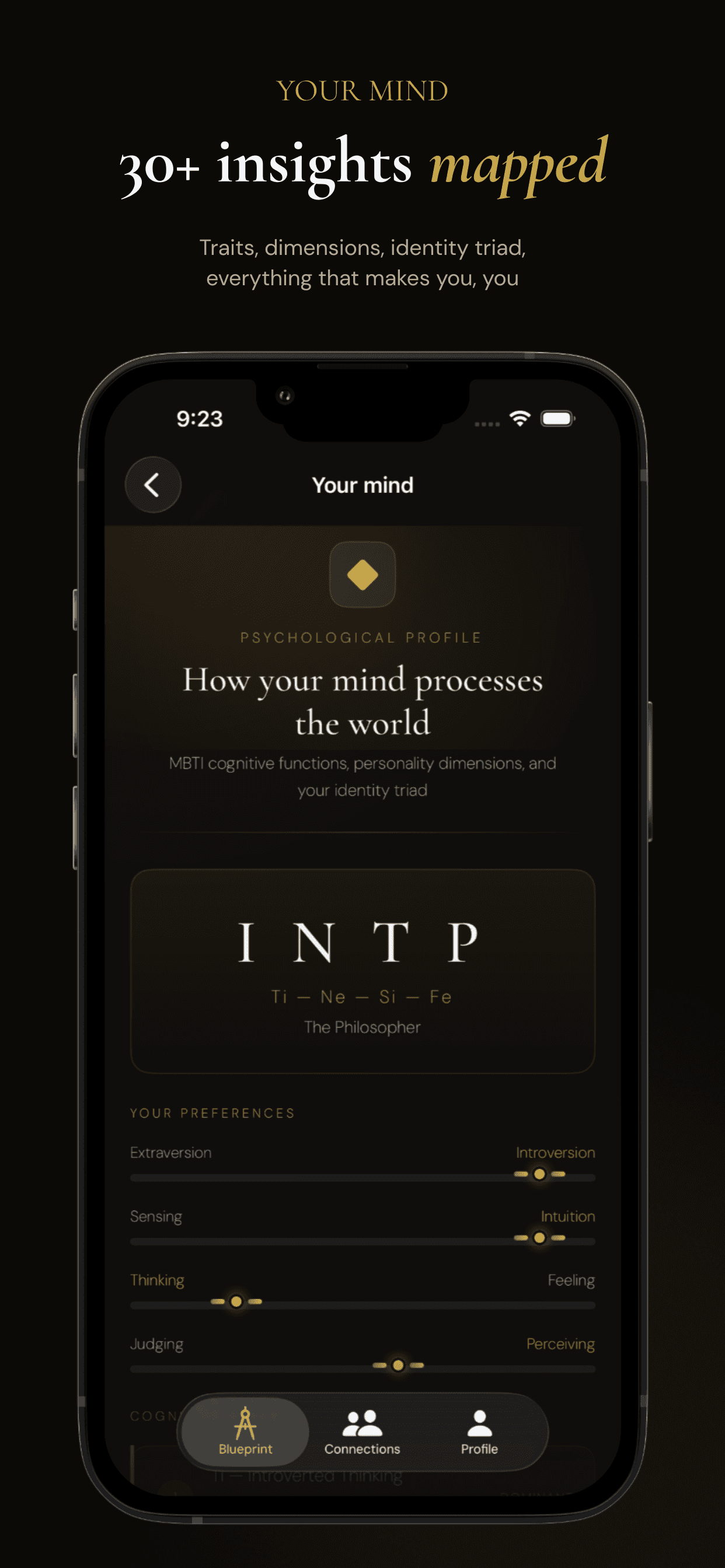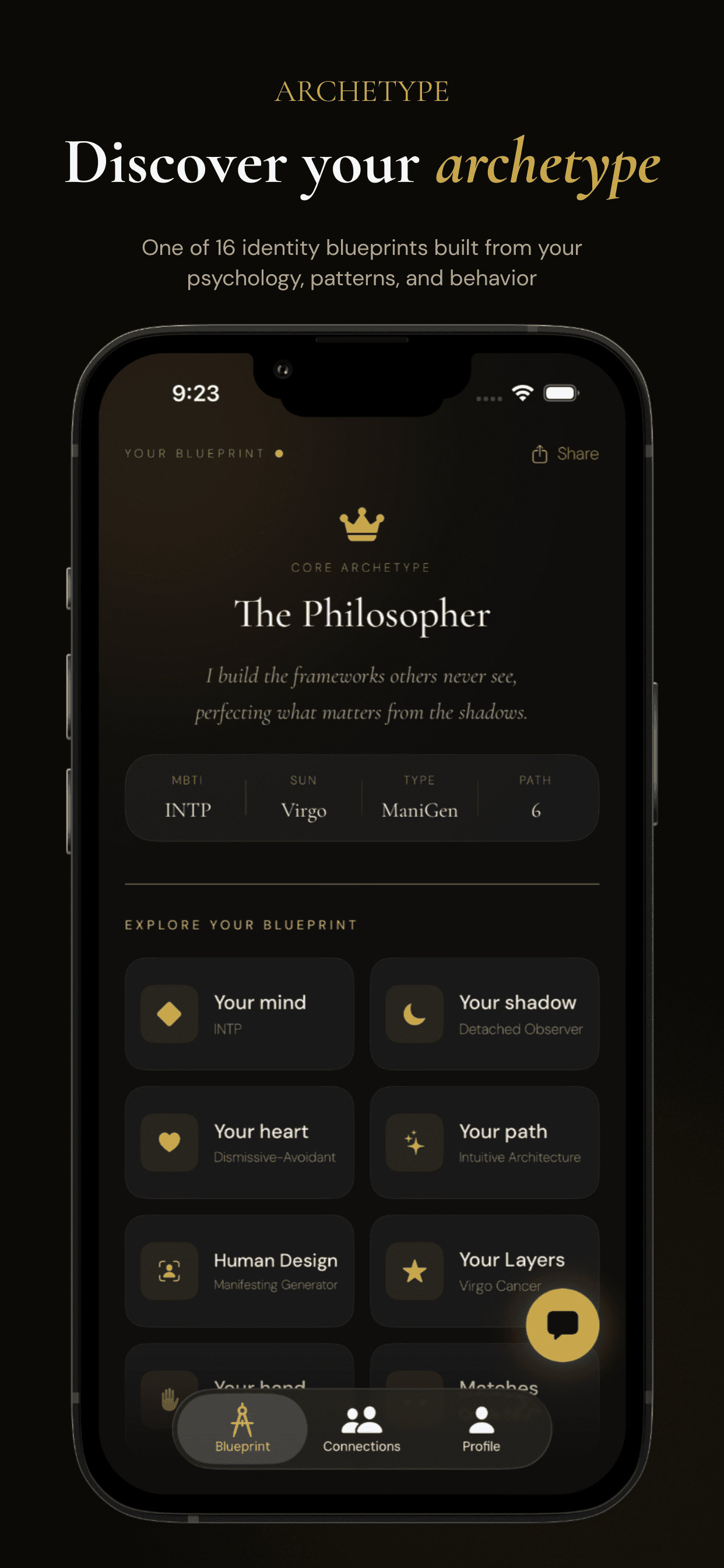 Product Design: Conceived and designed the full user experience — from the onboarding questionnaire flow to the blueprint reveal, shadow analysis, connection compatibility system, and AI chat feature — translating complex psychological frameworks into an intuitive mobile experience.